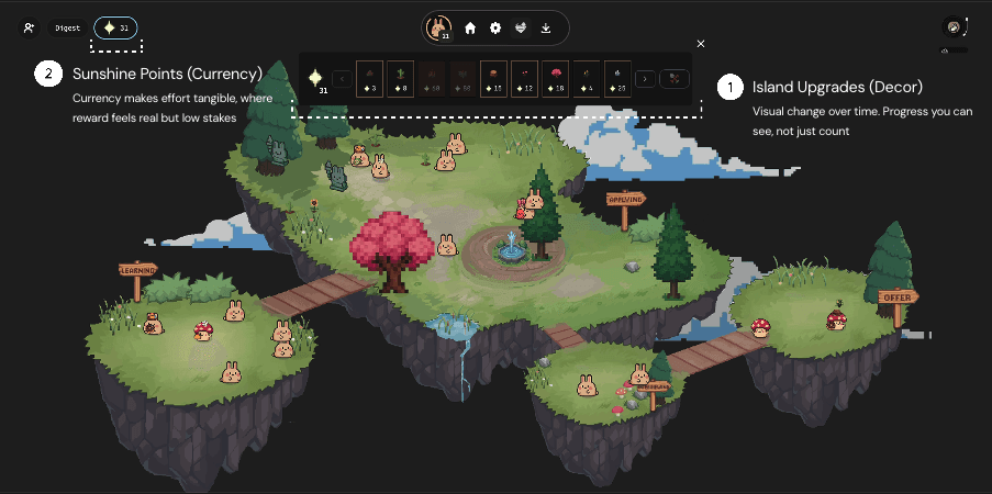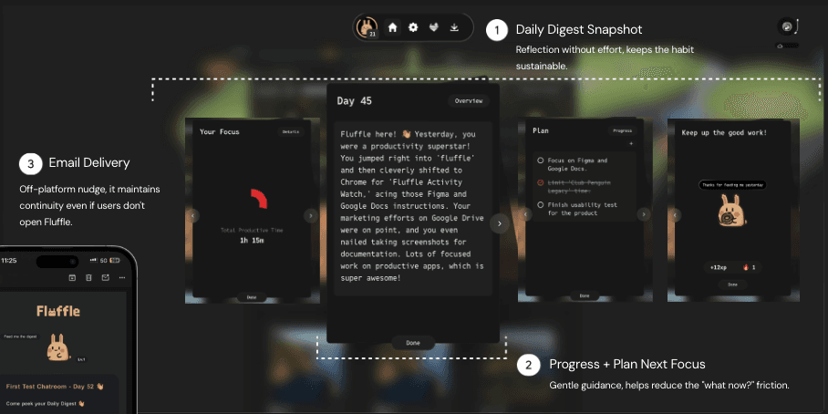 The final direction combined social presence, reflection, and ambient motivation into a repeatable, low-pressure loop.