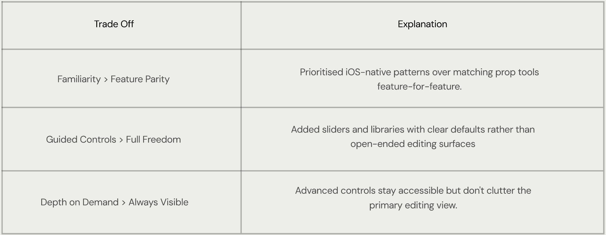 Prioritised iOS-native patterns over matching prop tools feature-for-feature.